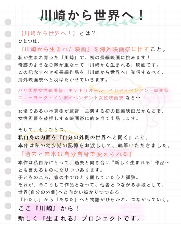 また、当該クラウドファンディングが目標金額に達しない可能性もありますが、ご支援いただいた資金と監督自らが調達する資金によって、映画の完成・映画祭へのエントリーおよびリターンの対応については責任を持って対応させていただく予定です。必ず完成させます!ご安心ください。