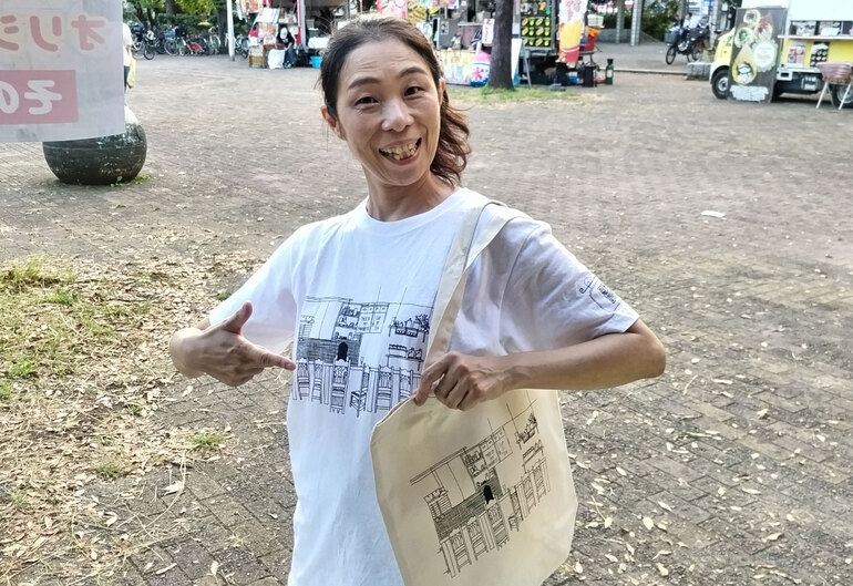 このイベントには、中根が運営するギャラリー世田谷233として出店。内容はシルクスクリーンという印刷手法で、Tシャツやトートバッグに自分で描いた絵をプリント体験できるワークショップです。ブースはこんな感じで設営。お天気最高でした。