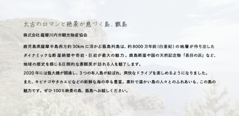 甑島PRプロジェクトにお力添えをいただいております、薩摩川内市観光物産協会さんから、甑島の魅力についてご紹介するコメントを頂きました!