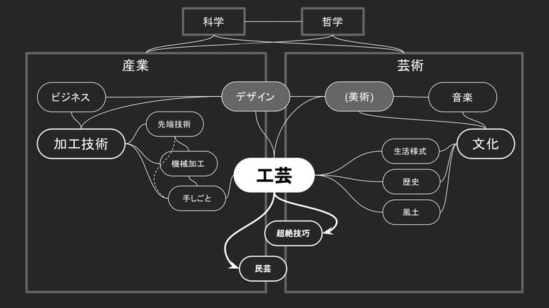 近年、工芸、クラフト、というキーワードをよく耳にするようになったから、この辺りの言葉を使って多くの人が何かを考えたいんだろうな、というのは感じておりまして、もしやニーズあるやもと思って、僕なりに最近思い浮かべている工芸を取り巻く概念を図にまとめてみたのがこちら。