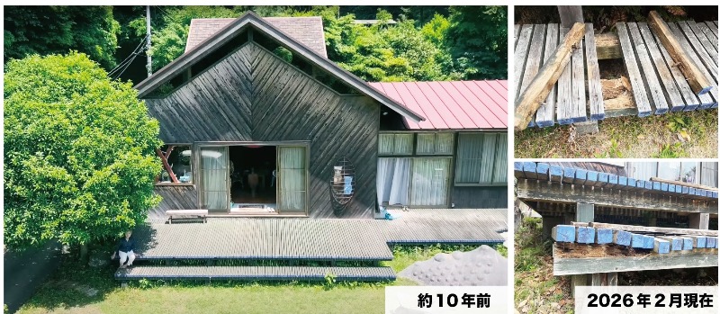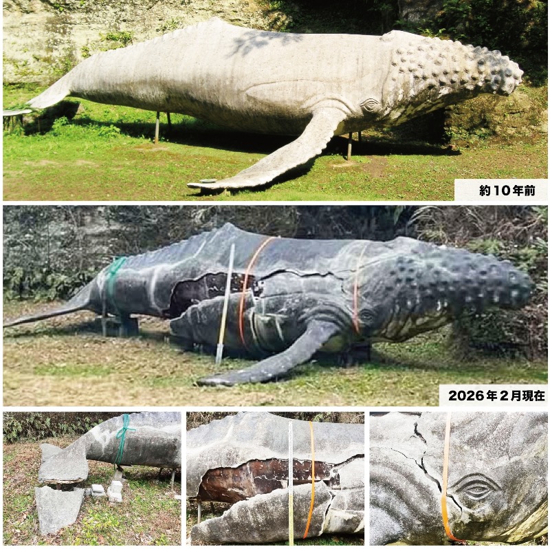 特に緊急の課題となっているのが、シンボルである7メートルを超える巨大オブジェ「くじら」です。長年の風雨により損傷が進み、空を泳ぐかのようなその雄姿を失ってしまう危機に瀕しています。また、ウッドデッキは老朽化し、一部は使用できない状態になっています。