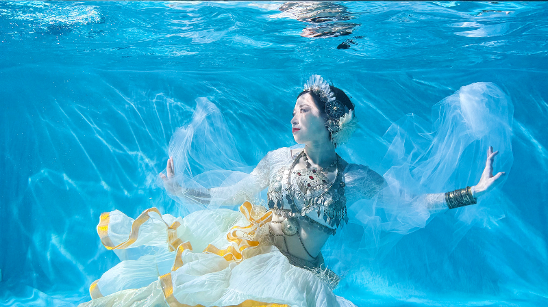 • 水中ベリーダンス映像とダンス: 水中を舞う人魚のような神秘的な映像の投影とダンスの融合