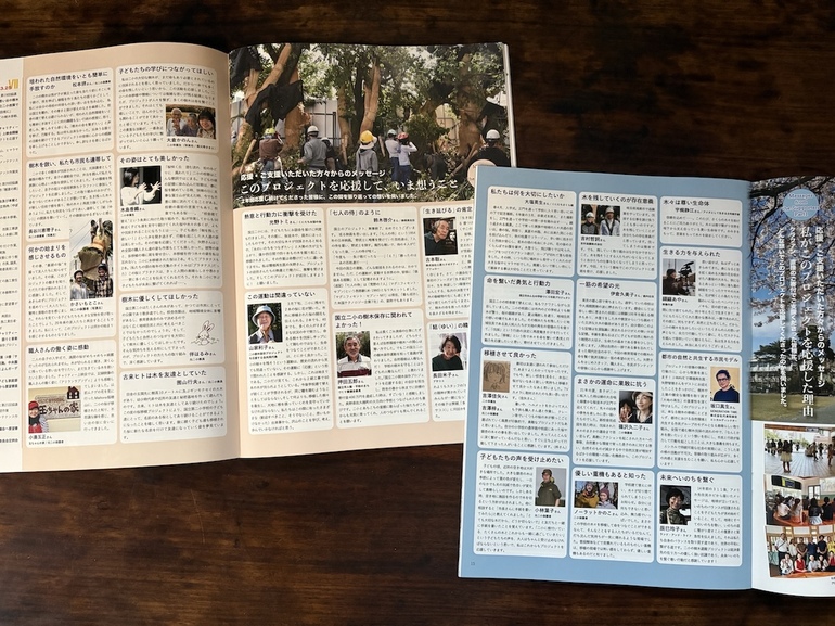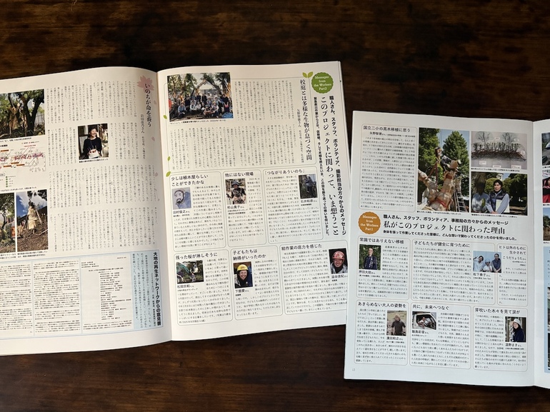 教育委員会のインタビュー、矢野さん、押田さんから職人さんへの呼びかけ文、作業に関わってくださった皆様の人数の総計も載せました。里親になってくださった皆様からのメッセージもいただきました