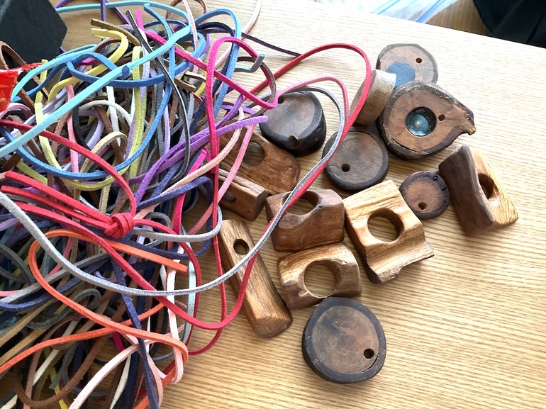 みらもりグッズ「梅」。移植時に落とした桜、ヒマラヤスギの枝を子どもたちと一緒に磨いてペンダントにしました