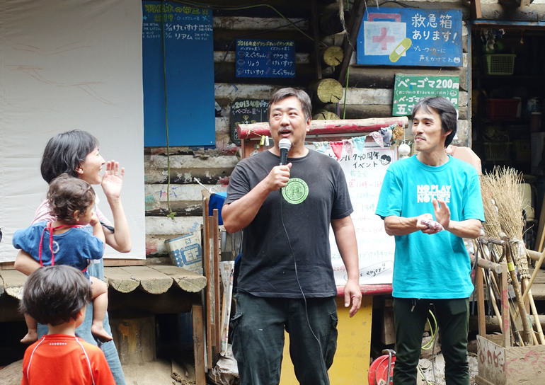 2019年7月、羽根木プレーパーク40周年記念イベントにて。歴代プレーリーダーとして祝辞を述べるクロボーさん(中央)