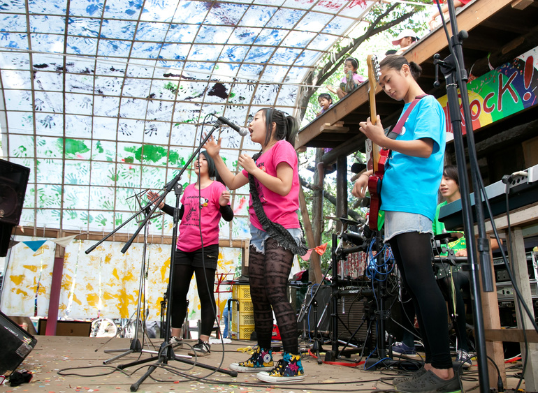 企画者のみんなの熱意に巻き込まれ、出演者はもちろん、ライブに出演しない若者や来園者の親子、地域の大人たちも一緒になって準備を進め、ついに巨大なステージが完成!出演者もこの日に向けて各々練習を重ね、ライブ当日を迎えました。ここからはライブの様子を写真でお楽しみください!