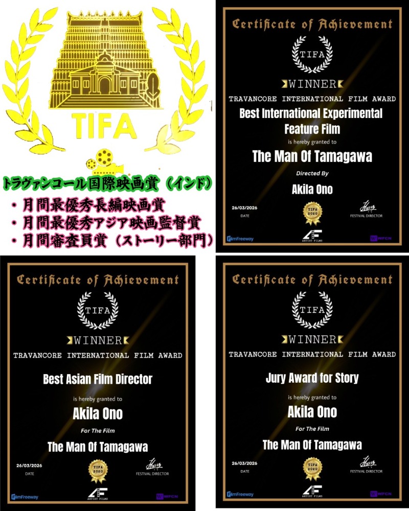 トラヴァンコール国際映画賞(インド)で賞をいただきました。月間賞というやつです。