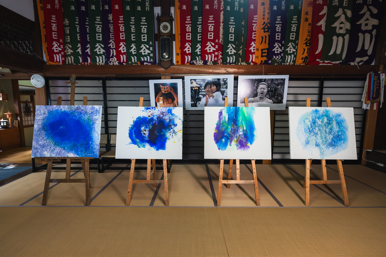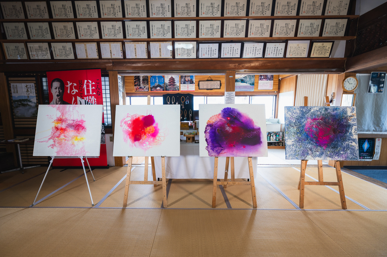 また、会場内には松井画伯の油彩画も展示し、本堂の空間と美しく調和していました。