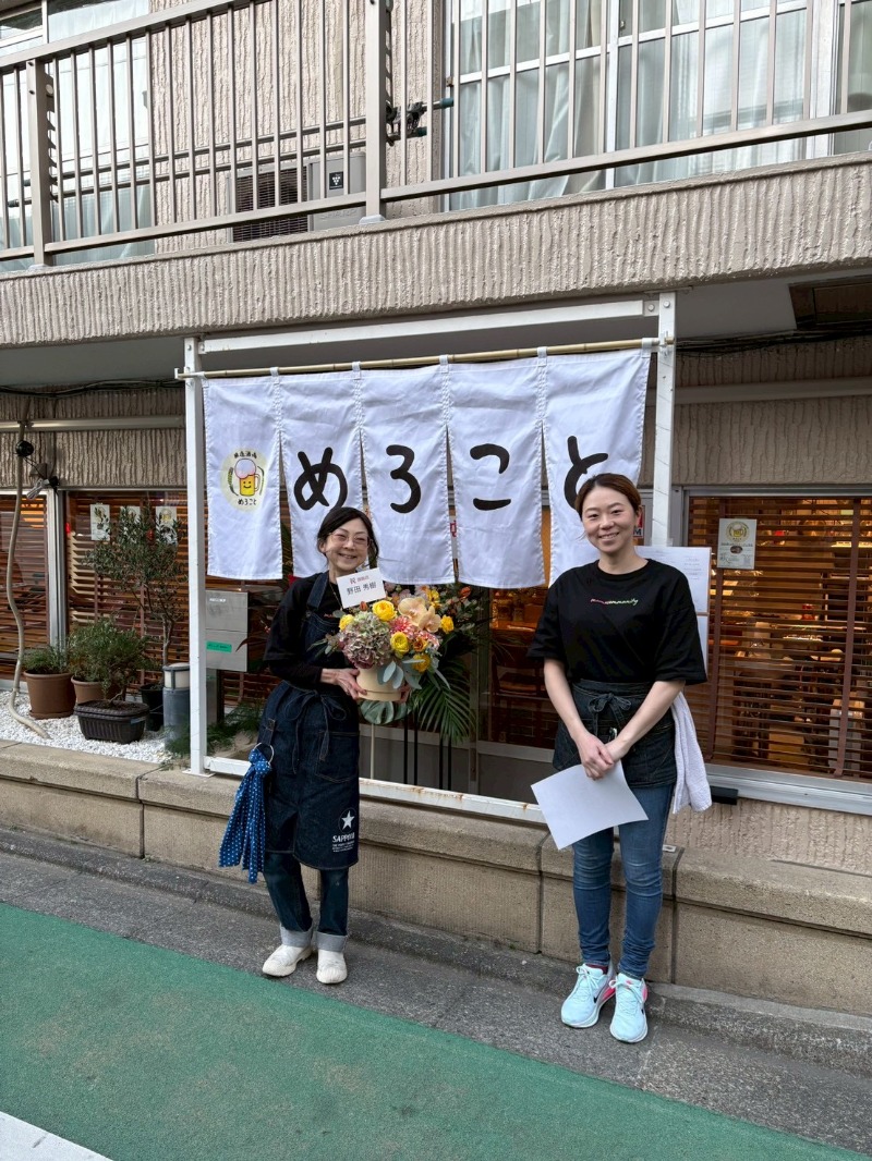 (左)店舗前でお祝いのお花と共にパシャリ (右)店内の様子