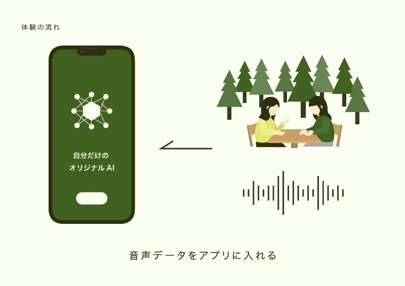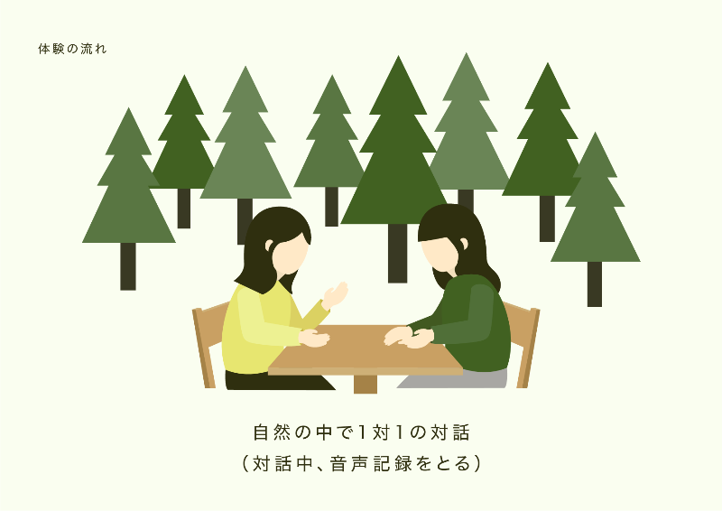 自然の中で、1対1で対話を重ねます。対話中、音声記録をとり、終了後にアプリに音声データを入れます。その後、好きなタイミングで、自分の記録に質問・相談を重ねていきます。