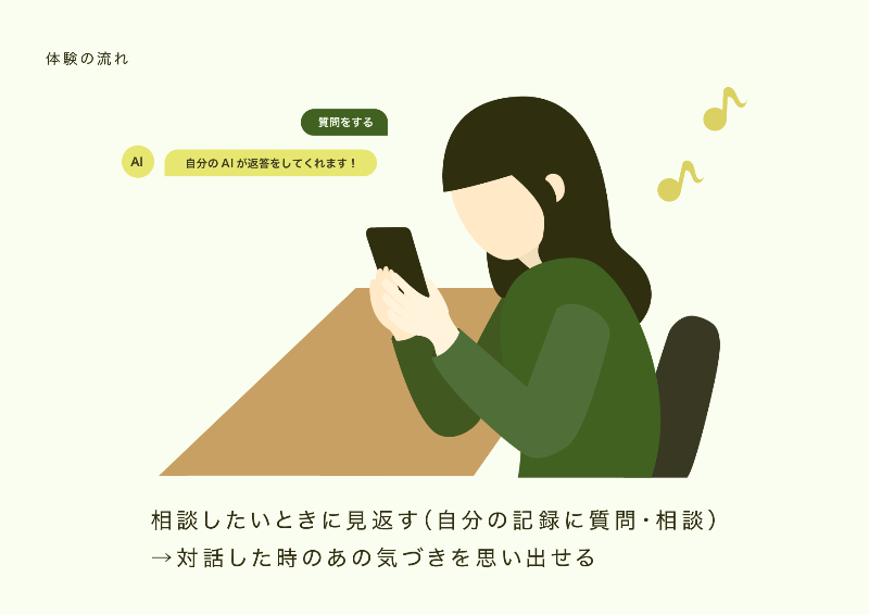 自然の中で思い出した価値観や欲求を日常でも思い返せるようになります。また、アプリを使い、対話中の自分にいつでも相談することができます。(対話のデータをAIが分析し、そのデータに対して好きな質問ができます。)