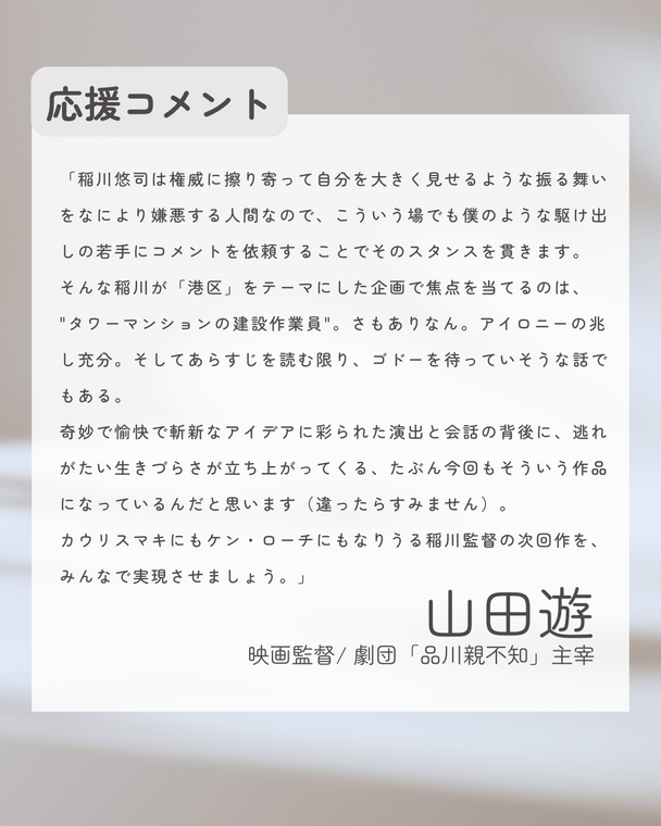 昨年のぴあフィルムフェスティバルで出会った才能のある2人とこのような形で映画を作ることができ、日々貴重な経験をしております。みなさんから頂いたお金で、いい映画を作れるよう頑張りますので、ご支援どうぞよろしくお願いいたします。