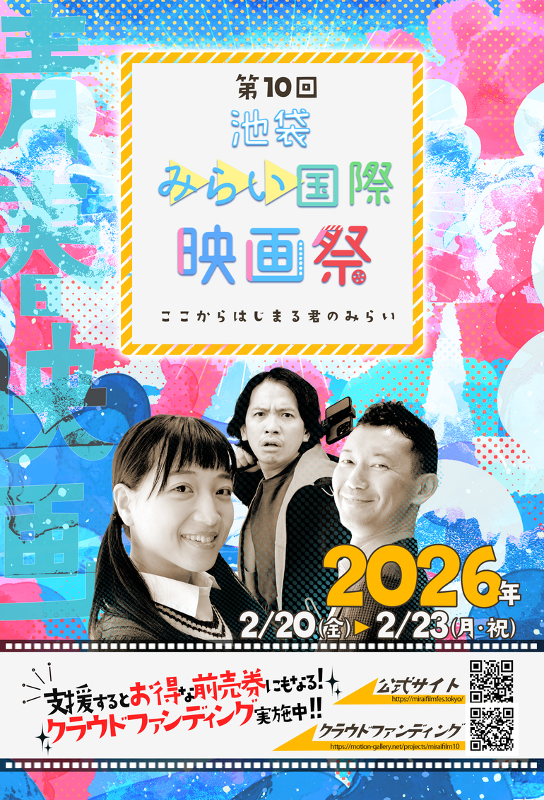 そして、池袋みらい国際映画祭は、記念すべき”10回目”の開催を迎えることになりました。 今までの映画祭に様々な形で関わってくださった全ての皆様に感謝いたします。 今年度の映画祭も作品上映、舞台挨拶、シンポジウムなど、内容盛り沢山の企画の数々で、昨年までを超える盛り上がりとなるように実行委員一同、準備を進めております。 2026年2月20日(金)〜2月23日(月・祝)に行われる当映画祭を是非お楽しみに!!!