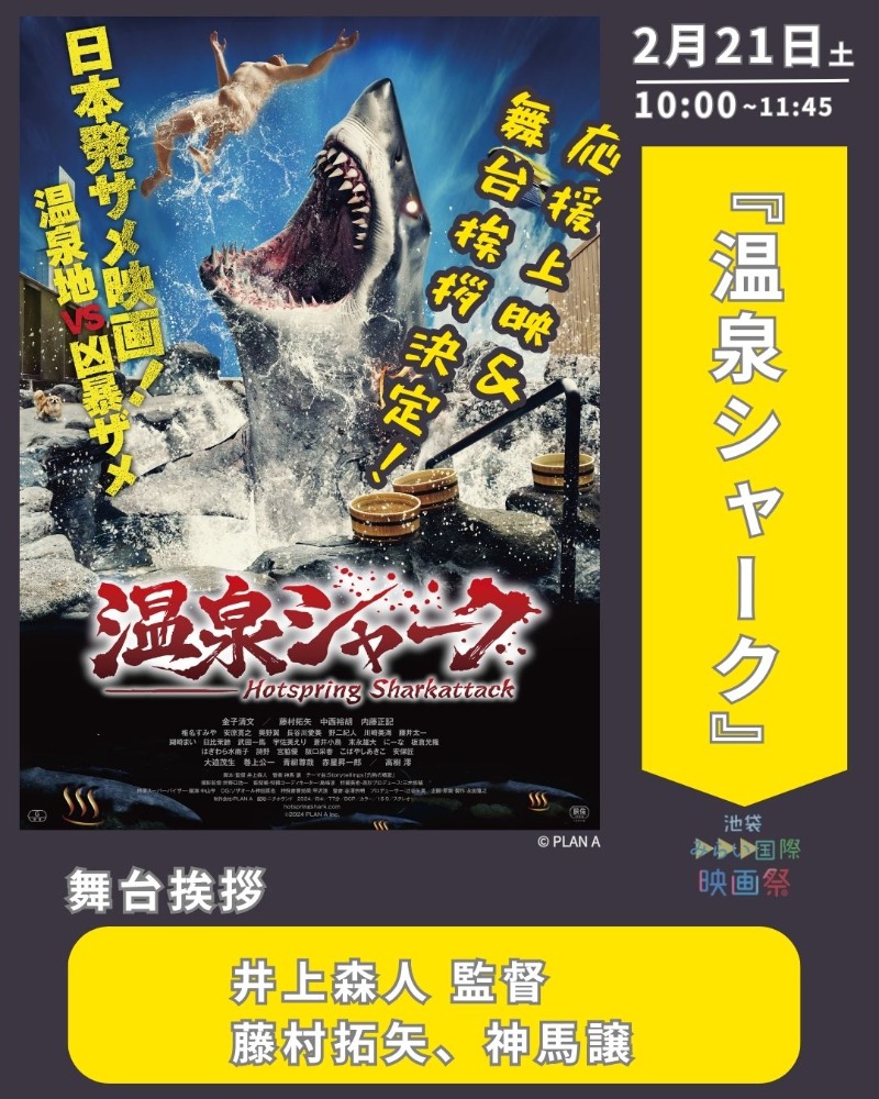 前回に続き、招待作品の映画『 温泉シャーク 』は、応援上映をやりますよ!登壇者も決定!!