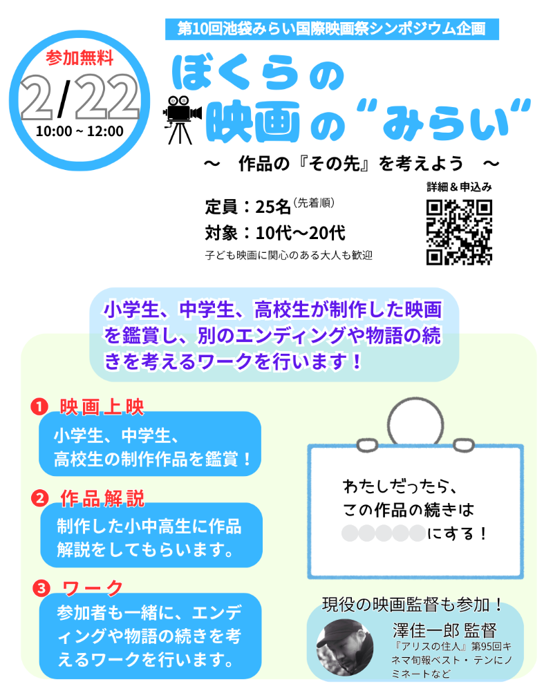 映画づくりに興味のある10代〜20代のみなさんへ向けたシンポジウム「ぼくらの映画の“みらい”〜作品の『その先』を考えよう〜」を開催します。本プログラムでは、小学生・中学生・高校生が実際に制作した映画作品を鑑賞し、「もし別のエンディングだったら?」「この物語の続きを考えるとしたら?」といった問いに、参加者自身が取り組みます。