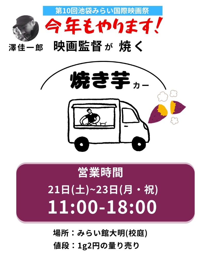 今年も澤佳一郎監督の焼き芋カーが映画祭期間中、みらい館大明にやってきます。