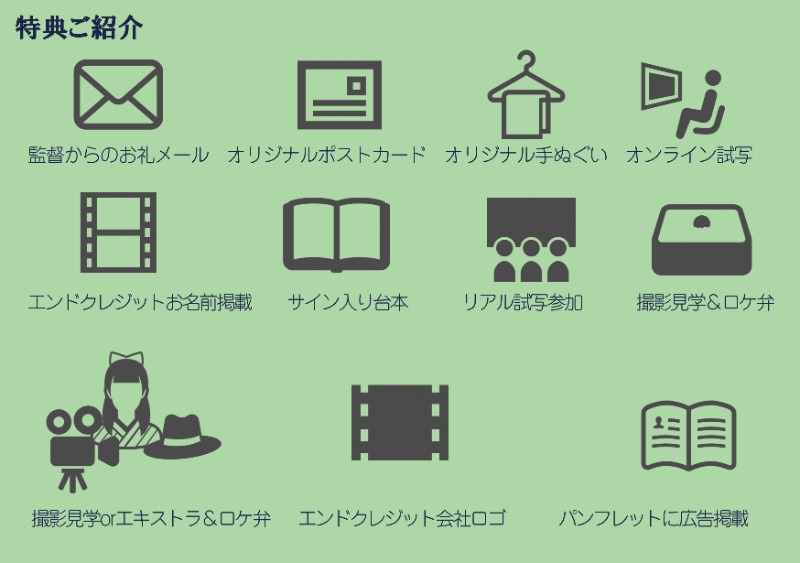 なるべく映画の世界を体験してもらえるように以下の特典を考えました。多くの特典が、お手元に届くのは完成以降になります。申し訳ございませんが、何卒ご了承ください。