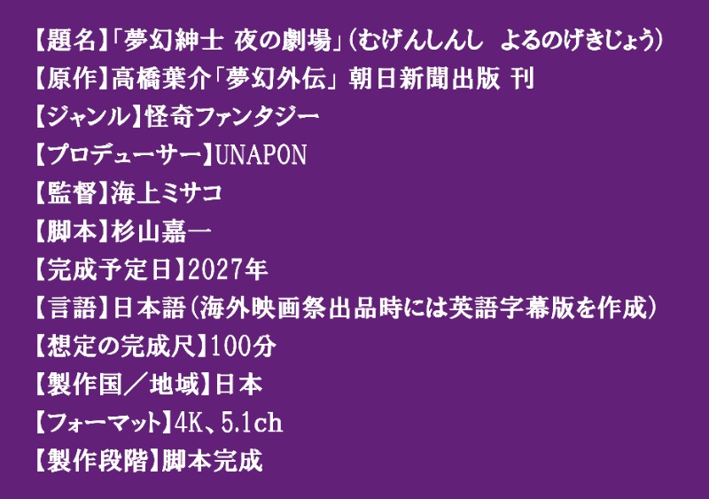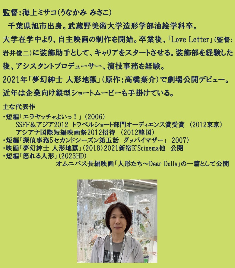監督の海上ミサコです。私は13歳でこの漫画に⼼を奪われ、映画化を決意し、2015 年にモーションギャラリーで資⾦の⼀部を募り第一弾「夢幻紳士人形地獄」を制作しました。(詳しくは当時のモーションギャラリーのページをご覧ください。)https://motion-gallery.net/projects/mugen-shinshi