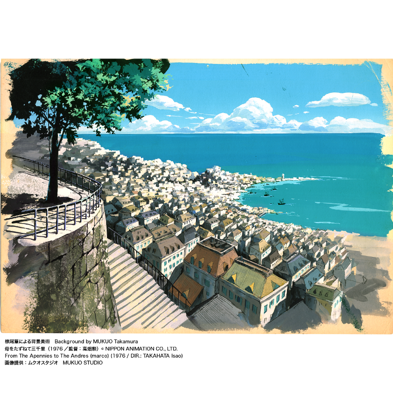 椋尾篁が描いた背景美術にも通じる、自然と人の営みが溶け合った風景を実感できます。