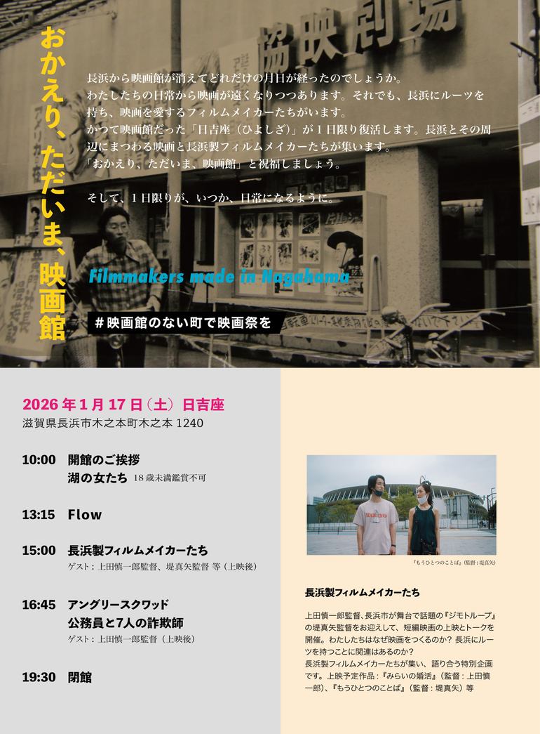 上田慎一郎監督、そして長浜市が舞台で話題の『ジモトループ』の堤真矢監督をお迎えして、短編映画とトークを行います。