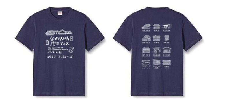 コジマユイさんが描いたなめりかわ建物フェスの10種類以上の公開建物を、背面にプリントしたTシャツです。