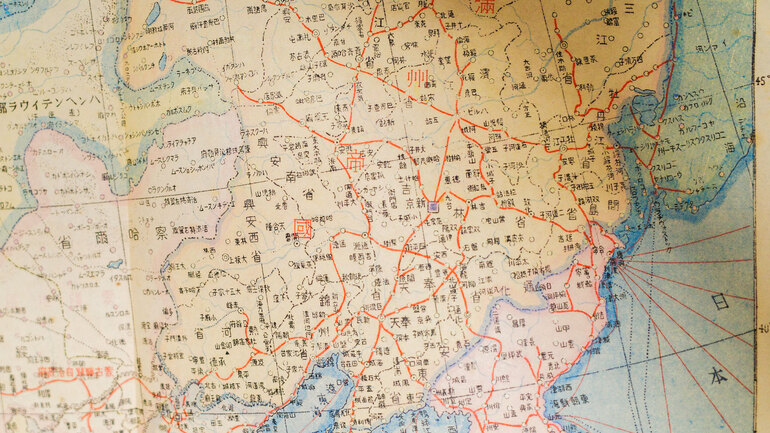 後藤卓也館長が「謄写印刷の教則本における最高傑作ですよ」と手渡してくれたのは、慰問文集が発行された翌7月に出版された『堀井謄寫版印刷講習會講義要項』。びっしりと地名が書き込まれた中国大陸の大判地図。細かく、かつ、くっきりとした文字、ズレのない境界線、鮮やかな配色。印刷サンプルとして技術の粋を集められたそれには、大陸へのまなざしが精細かつ明確に描かれていました。(水野)
