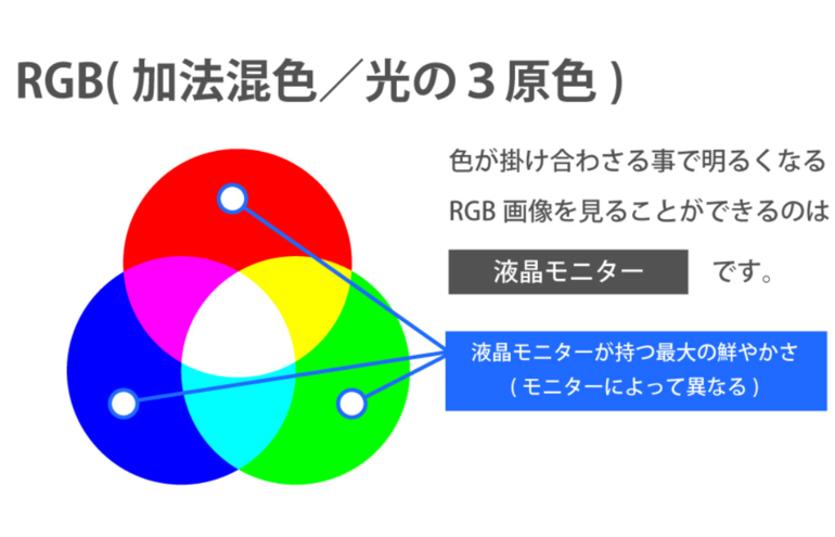 RGB画像は色と色が重なった部分(掛け合わせた部分)では明るくなり、3色が全て重なると白になることから「加法混色」と呼ばれていてます。RGB画像を表示できるのは、液晶モニターやプロジェクターです。