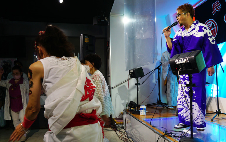 そしていよいよ前半のラストは司家 征樹さん!幡随院長兵衛 俎板の鯉で美声を聴かせてくださいます。途中、しんみりとたっぷり聴かせる音頭になったかと思うとまた盛り上がり…。もう最後は踊り子の皆さんが狂喜乱舞に!キャーーー!!!