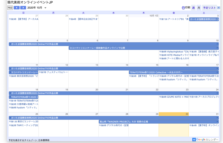 コロナ禍に急増した現代美術系のオンラインイベントの情報をGoogleカレンダーに登録し、情報共有・発信を有志で行っています。