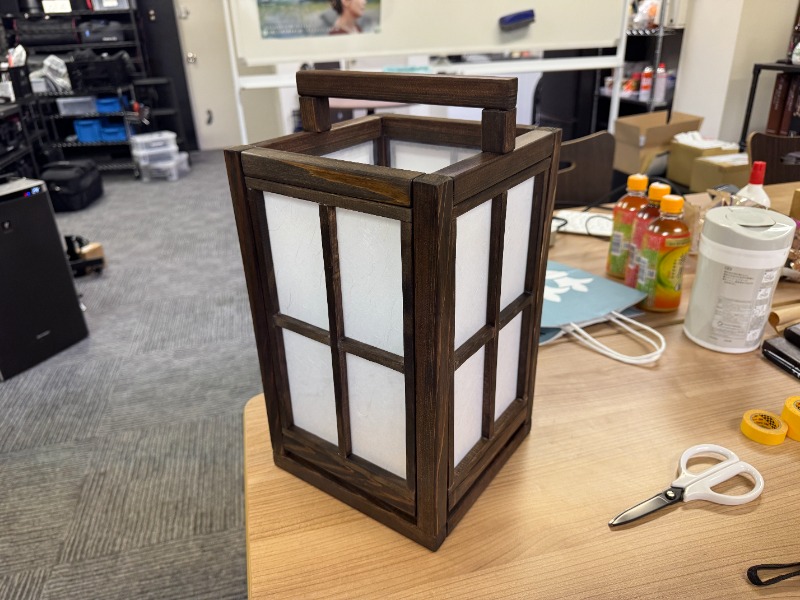 木材を買ってきて、カットしてヤスリで削り、オイルステインで色を塗って木工用ボンドで組み立てております。ちなみに貼っている和紙はプラスチック製のため、比較的丈夫!!!