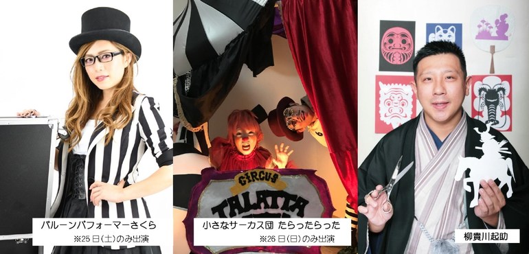 バルーンパフォーマーさくら、小さなサーカス団 たらったらった、紙切り芸人の柳貴川起助が出演します。