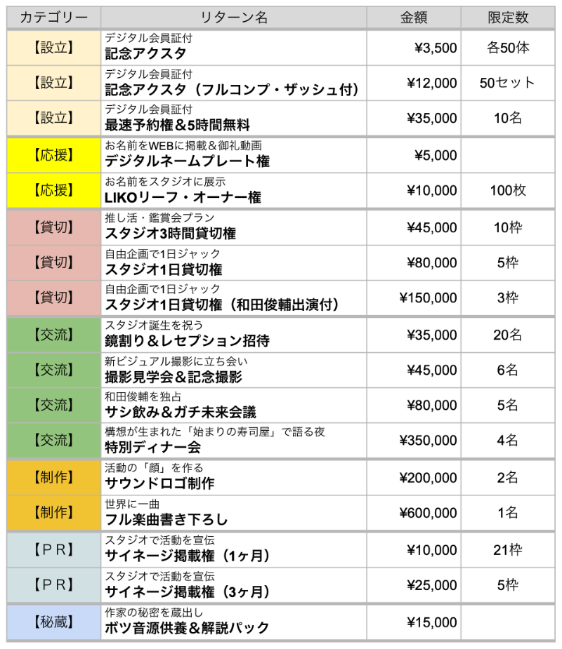 本プロジェクトは「プロダクションファンディング(All-in方式)」で実施します。目標金額に満たない場合でも、自己資金を補填するなどして、スタジオ設立とリターンの履行は必ず実行いたします。工事の進捗により、オープンの日程が多少前後する可能性はありますが、その際は随時ご報告いたします。