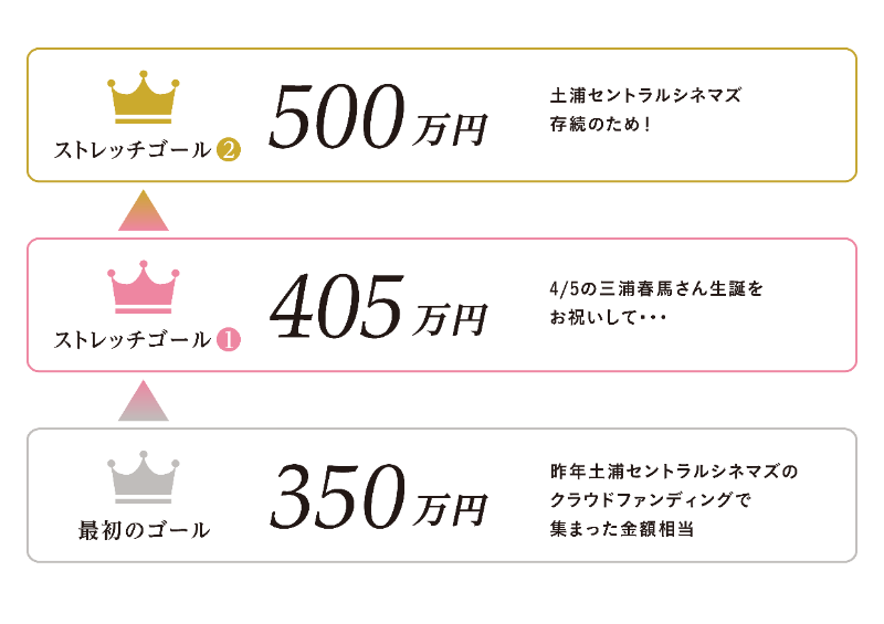 遠方の方はなかなか足を運ぶことが難しいなど、地理的制約がおありの方も沢山いらっしゃるとは思います。私もその1人です。現在、土浦セントラルシネマズさんでは東日本大震災以降、シアター2再開ができていません。再開にあたりエアコン設置費をプレゼント、さらに長く味あるミニシアター作品を上映し続けていただきたいと思い、クラウドファンディングに挑戦させていただきました。皆様と末永く「この世界の片隅に」はじめ沢山の名作や、三浦春馬さんの作品を土浦セントラルシネマズさんで一緒に観たいと強く思います。多くの皆様に共感いただけると嬉しいです。