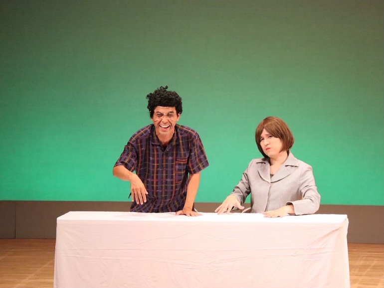 「沖縄の現状の問題」をテーマにしたお笑いコントで会場は笑いに包まれていました。