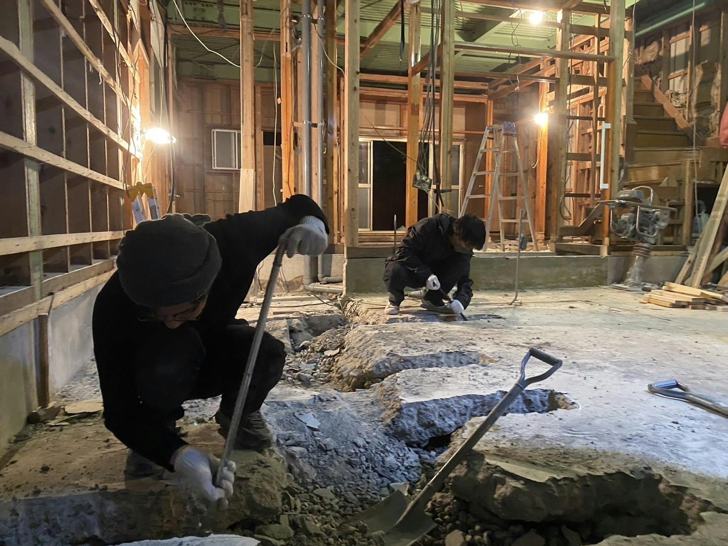土間コンクリートのハツリ作業を行うふちべ・うえすぎ