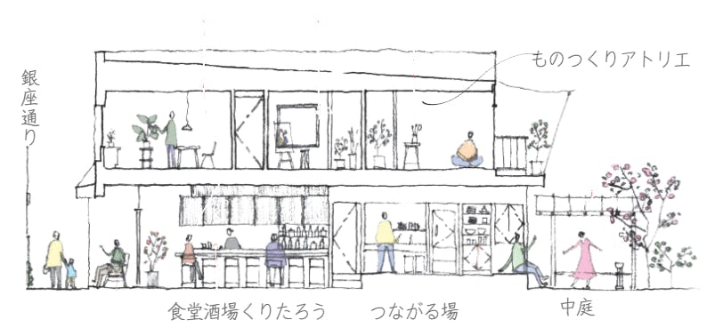通りに面する1階は地域にひらく場、2階はこもって「ものつくり」する場