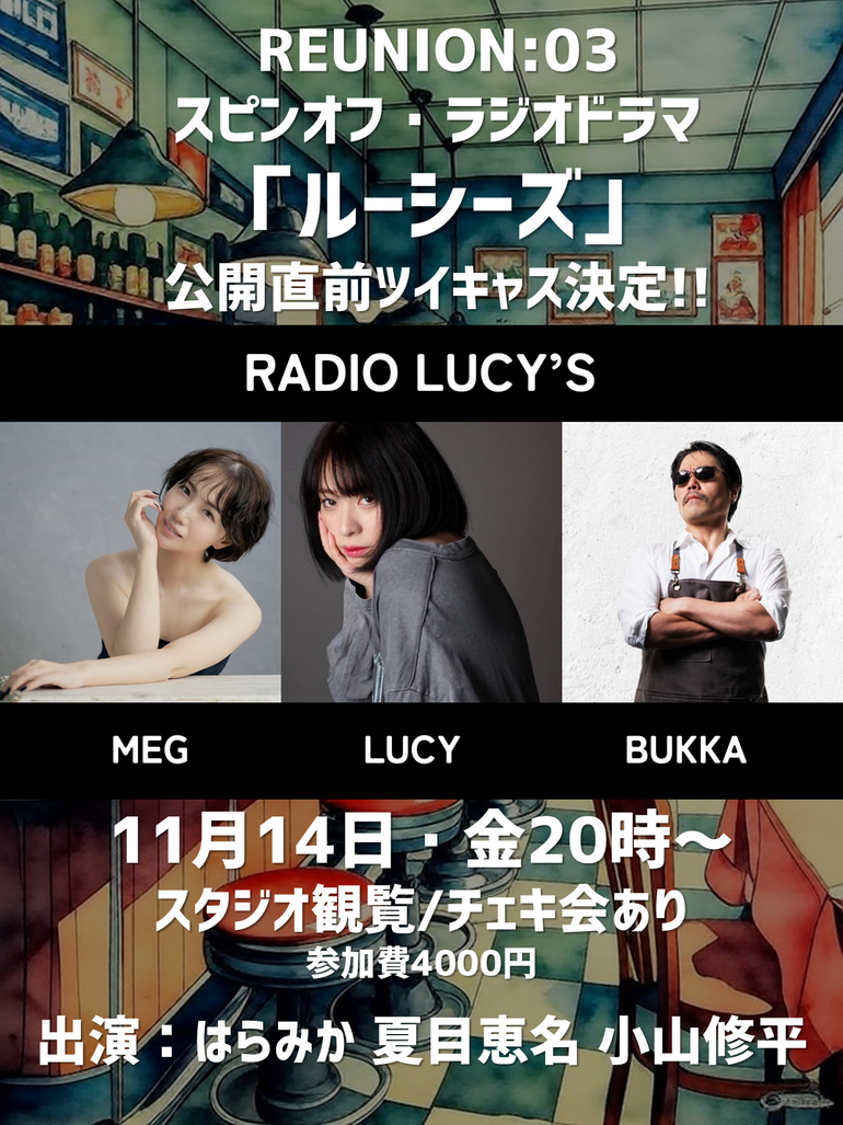 <緊 急 告 知> 「REUNION:03 -DAYDREAM-」本編に登場する第三の酒場「ルーシーズ」より、ルーシー役はらみか、メグ役夏目恵名、ブッカ役小山修平が11月14日20時より公開ツイキャス! ラジオドラマ解禁前夜、果たしてどんな話が飛び出すのか?!