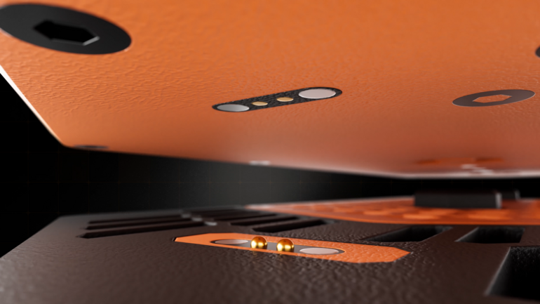 モデル同士を縦方向に積層した場合、底面および上面に配置された磁気端子(マグネット接点)によって、電源が自動的に連動します。