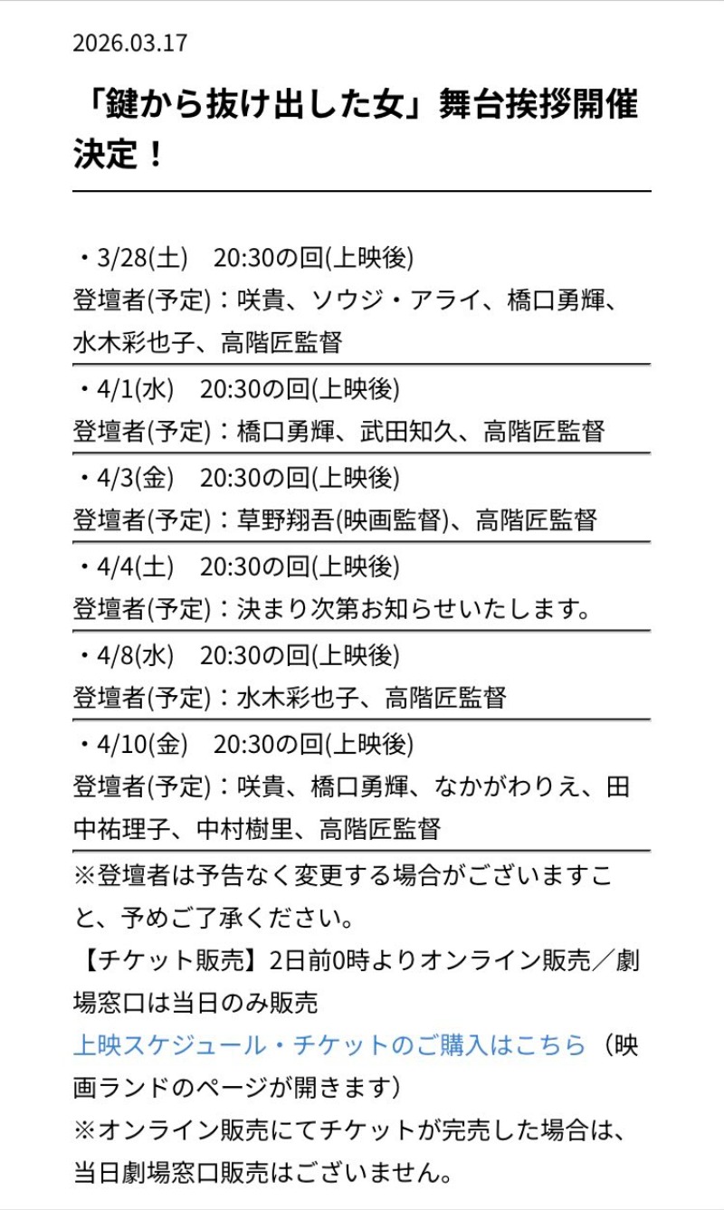 毎週土・水・金曜日にはキャストや監督、ゲストの方を交えての舞台挨拶やトークショーも開催いたします。