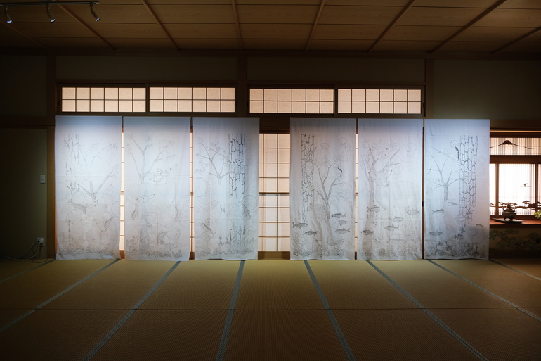AIRでは、ペン画の作品を綿布に描くチャレンジをしました。布は紙と違って畳んだり、それ単体で吊るしたりと様々な展示形式を選ぶことができます。そのため、布は乗せる作品や展示空間をあまり選ばす、アートとの親和性が高いと気が付くきっかけとなりました。