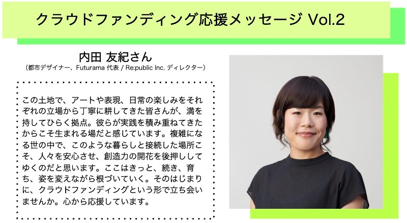 ここはきっと、続き、育ち、姿を変えながら根づいていく。そのはじまりに、クラウドファンディングという形で立ち会いませんか。心から応援しています。