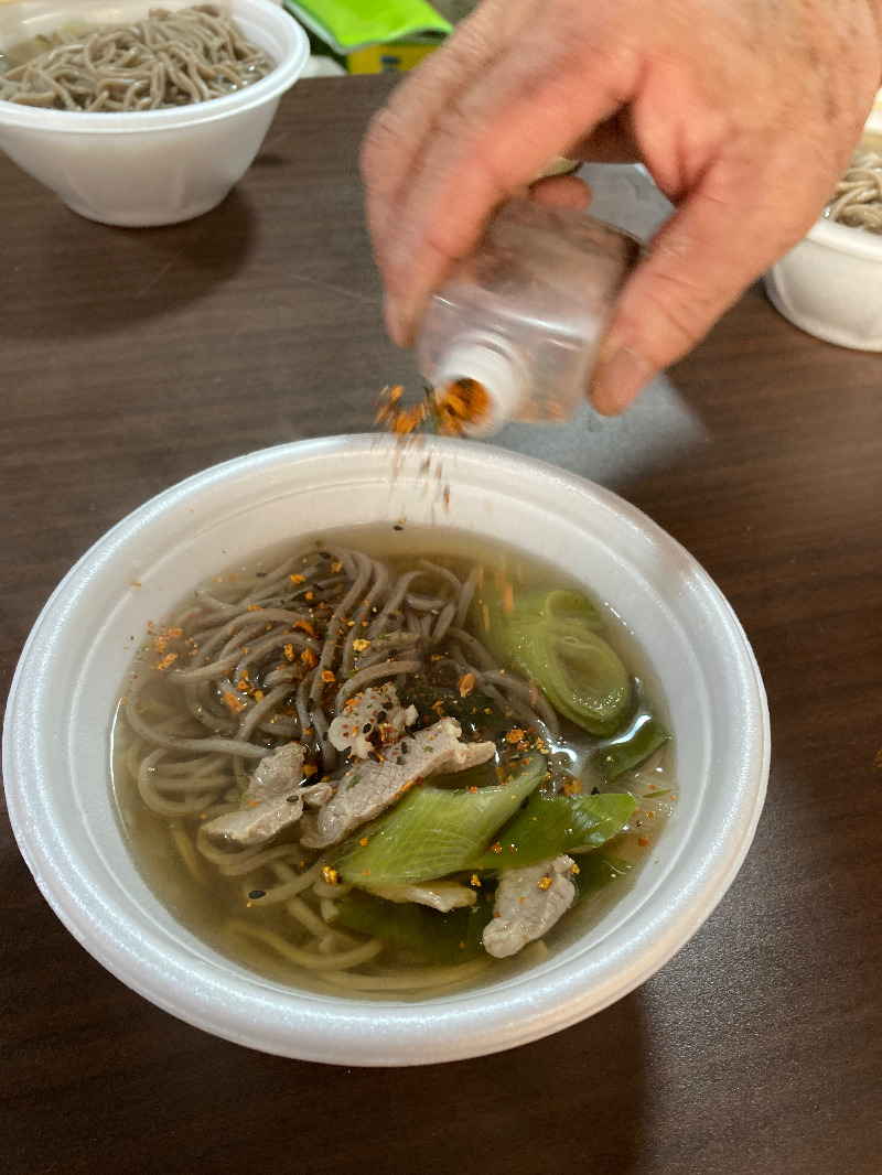 そこで榎本さん直伝のかっぱ汁をいただきました。かっぱ汁とは、豚肉と太めのねぎが入ったそばで、そこにみかんの陳皮で作った自家製の一味を多めに振り掛けたら完成。僕の分には(たぶん手が滑って)多めに振り掛けられ、榎本さんからスパイシーな松戸の洗礼を受けたのでした。