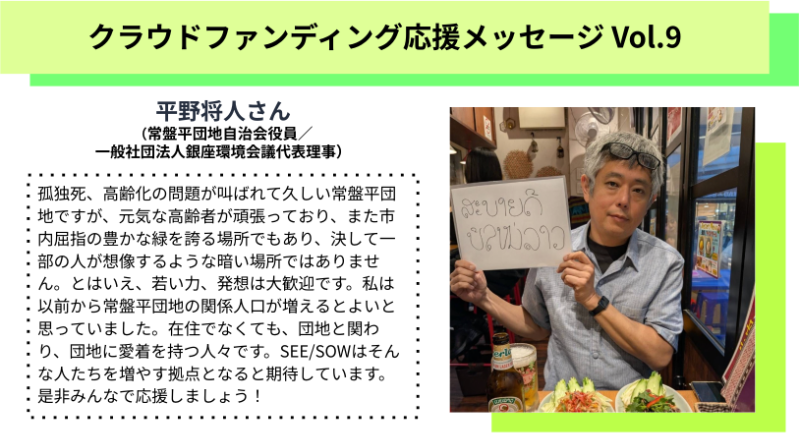 とはいえ、若い力、発想は大歓迎です。私は以前から常盤平団地の関係人口が増えるとよいと思っていました。在住でなくても、団地と関わり、団地に愛着を持つ人々です。SEE/SOWはそんな人たちを増やす拠点となると期待しています。是非みんなで応援しましょう!