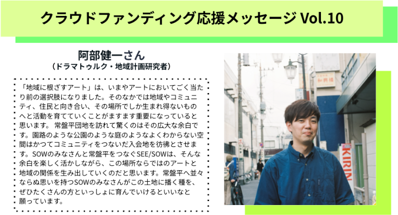 常盤平団地を訪れて驚くのはその広大な余白です。園路のような公園のような庭のようなよくわからない空間はかつてコミュニティをつないだ入会地を彷彿とさせます。SOWのみなさんと常盤平をつなぐSEE/SOWは、そんな余白を楽しく活かしながら、この場所ならではのアートと地域の関係を生み出していくのだと思います。常盤平へ並々ならぬ思いを持つSOWのみなさんがこの土地に播く種を、ぜひたくさんの方といっしょに育んでいけるといいなと願っています。