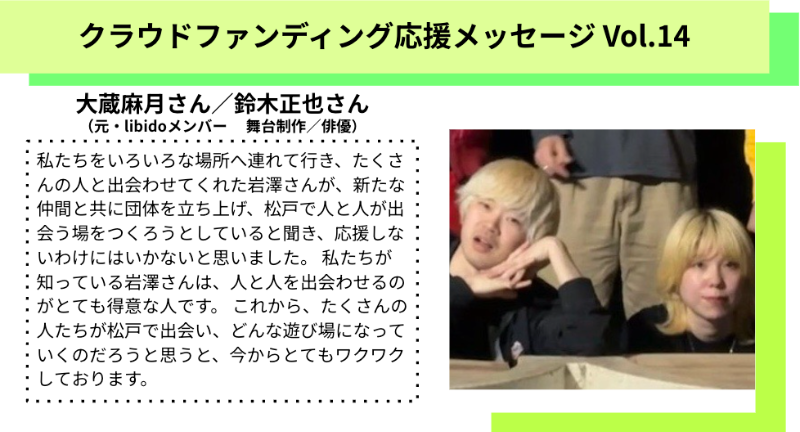 届いた応援の声をご紹介します|Vol.14 大蔵麻月さん/鈴木正也さん