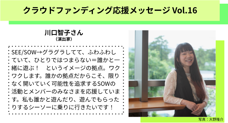 SEE/SOW→グラグラしてて、ふわふわしていて、ひとりではつまらない=誰かと一緒に遊ぶ! というイメージの拠点。ワクワクします。誰かの拠点だからこそ、限りなく開いていく可能性を追求するSOWの活動とメンバーのみなさまを応援しています。私も誰かと遊んだり、遊んでもらったりするシーソーに乗りに行きたいです!