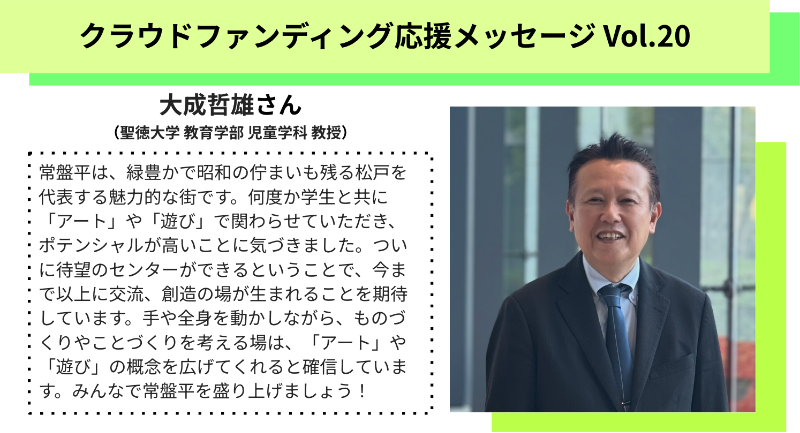 常盤平は、緑豊かで昭和の佇まいも残る松戸を代表する魅力的な街です。何度か学生と共に「アート」や「遊び」で関わらせていただき、ポテンシャルが高いことに気づきました。ついに待望のセンターができるということで、今まで以上に交流、創造の場が生まれることを期待しています。手や全身を動かしながら、ものづくりやことづくりを考える場は、「アート」や「遊び」の概念を広げてくれると確信しています。みんなで常盤平を盛り上げましょう!