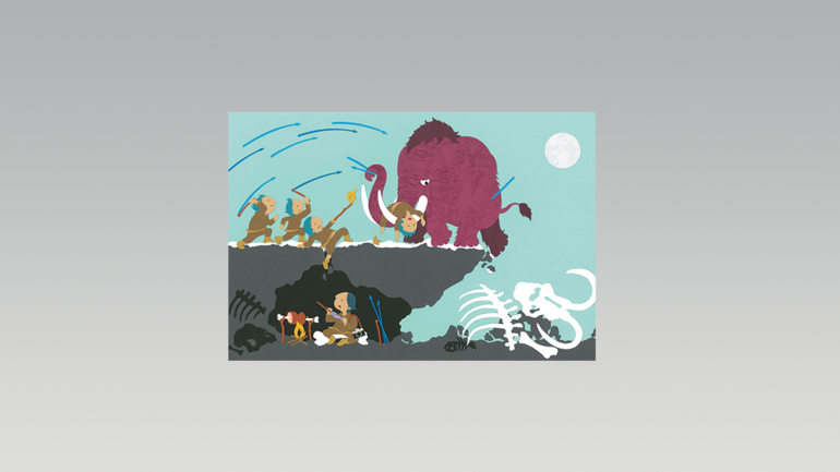旧石器時代にタイムトラベルした関野さんを切り絵で描きました。マンモスハンターの投槍器や追い込み猟といった学術面も踏まえています。骨付き肉はまだ焼けてなかったみたい。食いしん坊でお茶目な関野さんです。