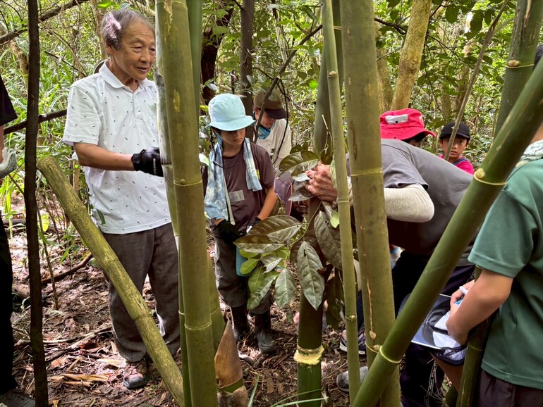 エコツーリズムセンターの船見千穂さんに頼まれ、西表島の小学生に石器で竹を切り、その竹で弓矢を作るワークショップを開いた。