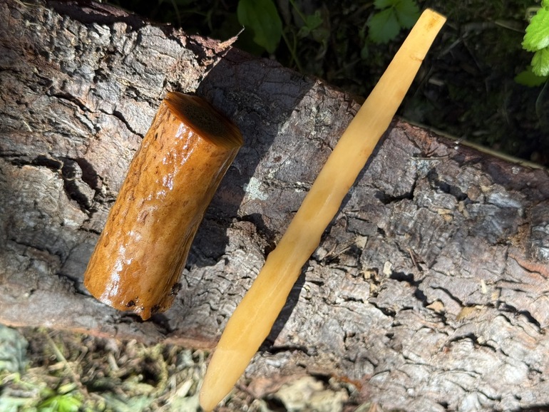 北海道で、エゾジカの角を手に入れて釣り針を作ることにした。まずは鹿角の真っ直ぐな部分7cmを切り取り水に漬ける。一晩で柔らかくなる。